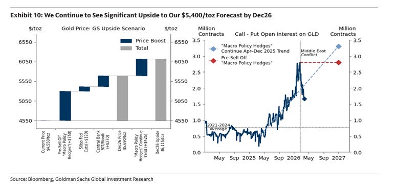 Goldman Sachs maintains its base case of $5,400/toz by end-2026, supported by three primary drivers.
