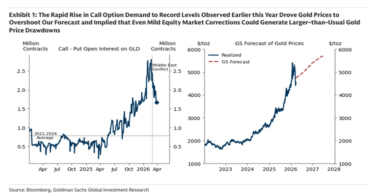 “The rapid rise in call option demand… implied that even mild equity market corrections… could generate larger-than-usual drawdowns in gold prices.”