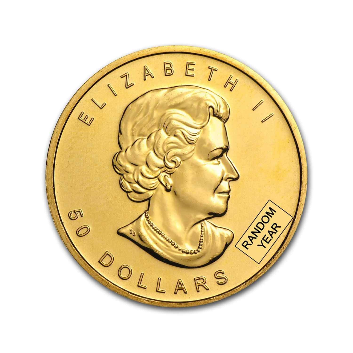 These 1 oz Gold Maple Leaf coins are .9999 fine Gold may be from any year. Buy Gold Maple Leafs to add to your Gold portfolio. Multiples of 10 are in mint tubes. Otherwise coins are in clear CoinZips.