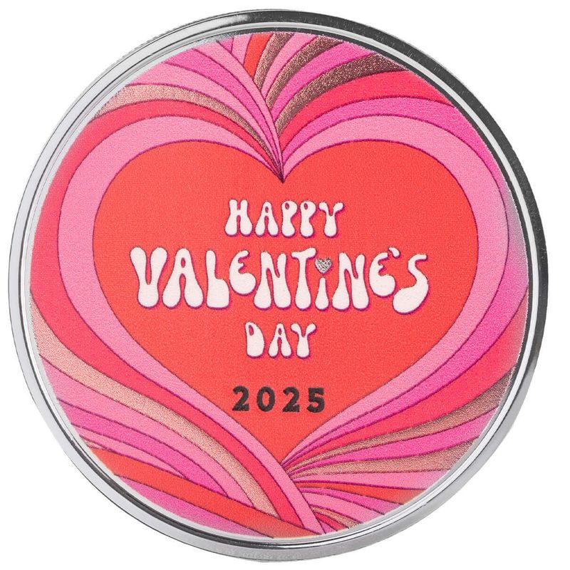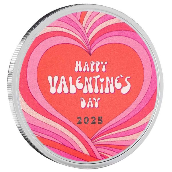 The Happy Valentine’s Day 2025 1 oz Silver Color Round features a delightful pink background adorned with a series of hearts radiating outward, each growing larger to symbolize expanding love and affection. At the center, “Happy Valentine’s Day 2025” is elegantly written, creating a bold and heartfelt focal point. The soft pink hues and the layered heart design combine to evoke warmth and romance, making this round a perfect keepsake or gift to celebrate the love-filled moments of 2025.