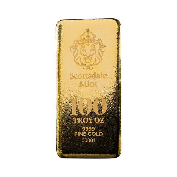 Fortify your precious metals portfolio with the Scottsdale Mint 100 Troy Ounce Gold Cast Bar. Containing exactly 100 troy ounces (3,110 grams) of .9999 fine gold, this substantial bar meets the highest purity standard in the global bullion market.